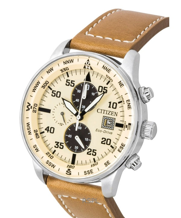 Citizen Eco-Drive Aviator Chronograph -nahkaranneke, beige kellotaulu, CA0880-15X 100M miesten kello